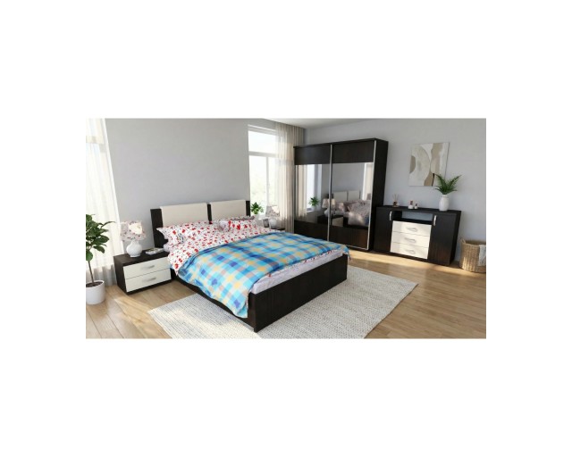 Dormitorul Laguna este o alegere moderna si practica datorita multiplelor spatii de depozitare. Dormitorul este compus din dulap cu 2 usi culisante cu oglinzi, pat pentru saltea de 160x200 cm cu 2 sertare, 2 noptiere cu cate 2 sertare si comoda cu 2 usi si 3 sertare.