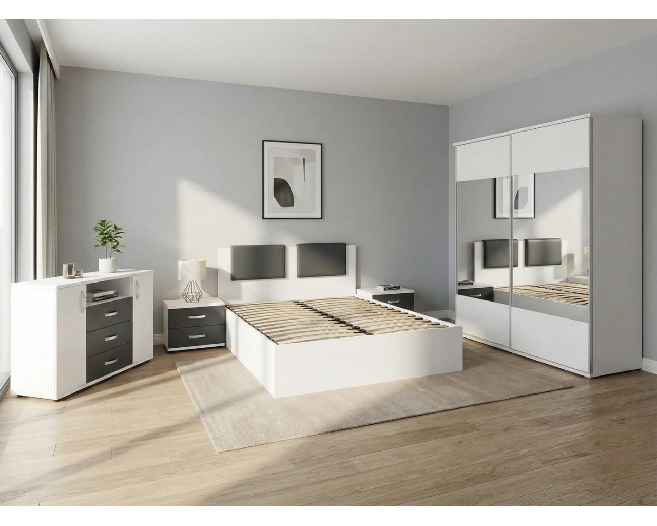 Dormitorul Laguna este o alegere moderna si practica datorita multiplelor spatii de depozitare. Dormitorul este compus din dulap cu 2 usi culisante cu oglinzi, pat pentru saltea de 160x200 cm cu somiera metalica rabatabila si lada, 2 noptiere cu cate 2 sertare si comoda cu 2 usi si 3 sertare.