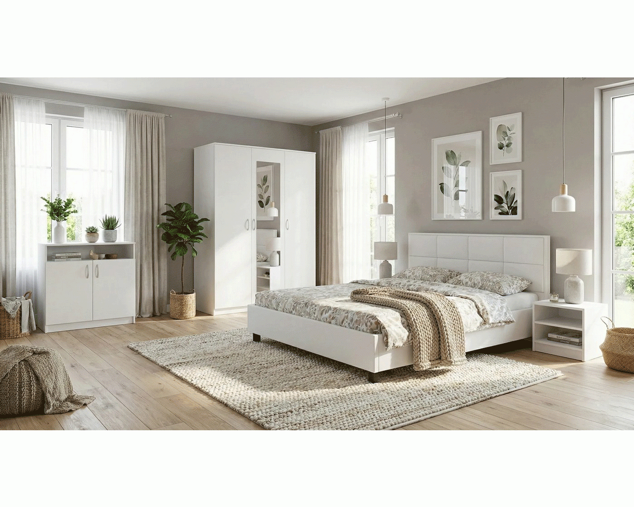 Dormitor Soft fabricat din PAL melaminat alb cu grosimea de 16 mm. Dormitorul este compus din dulap cu 3 usi si oglinda pe usa din mijloc, pat pentru saltea de 140x200 cm, 2 noptiere si 1 comoda cu 2 usi. Dulapul are 6 spatii de depozitare cu polite si 1 spatiu cu bara de haine pentru umerase. Dimensiunile dulapului sunt: latime: 135 cm , inaltime: 200 cm , adancime: 53 cm. Patul are somiera din PAL simplu inclusa. Dimensiunile patului sunt: latime: 150 cm , lungime: 205 cm , inaltime: 97 cm. Comoda are 2 spatii de depozitare in spatele usilor si unul deasupra lor. Dimensiunile comodei sunt: latime: 75 cm , inaltime: 87 cm , adancime: 39 cm. Noptierele au cate 2 spatii de depozitare. Dimensiunile unei noptiere sunt: latime: 46 cm , inaltime: 44 cm , adancime: 37 cm. Manerele sunt din plastic cu filet metalic, iar toate piesele au picioruse din plastic la baza comodei cu rol impotriva zgarierii pardoselilor.