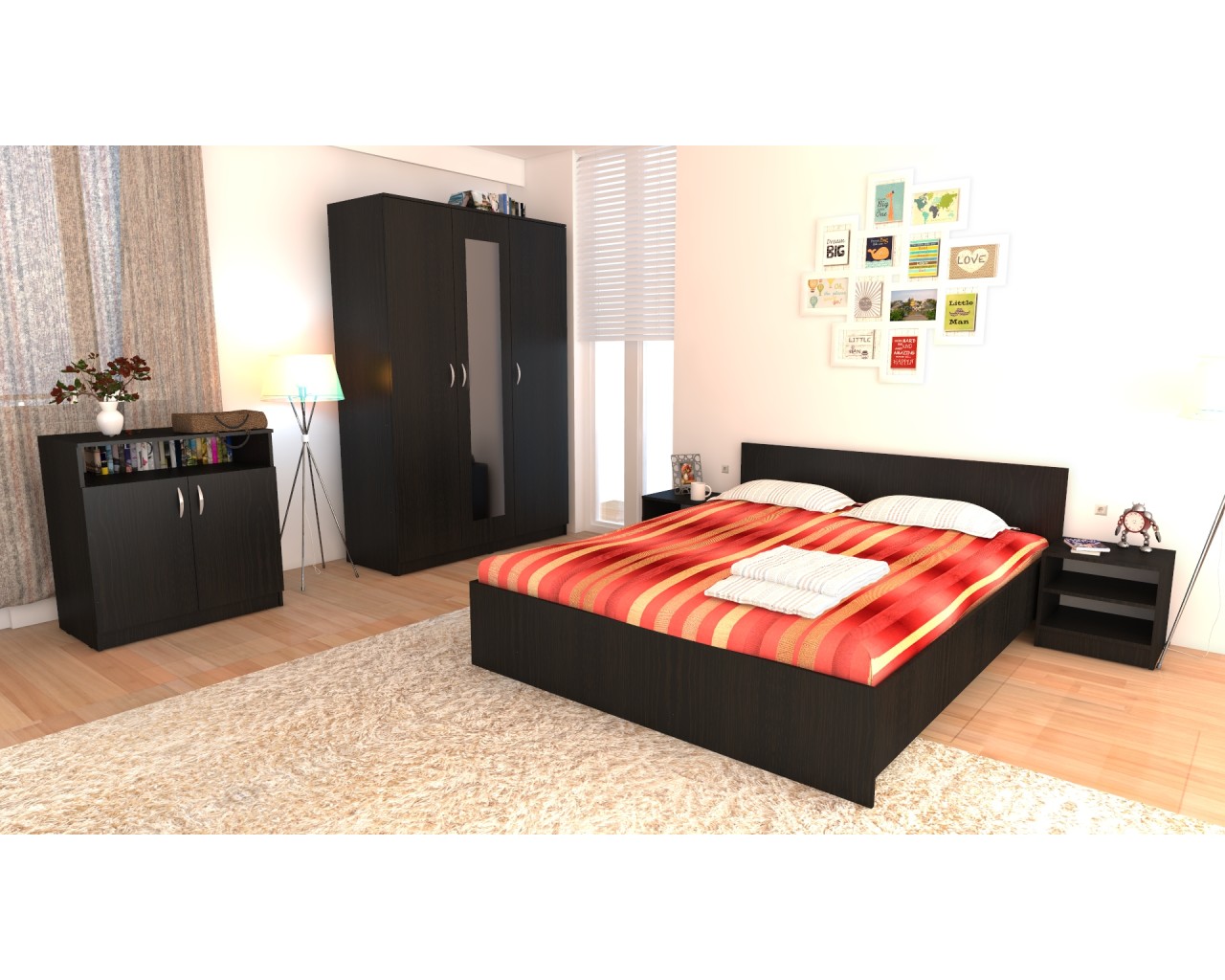 Dormitor Soft fabricat din PAL melaminat wenge cu grosimea de 16 mm. Dormitorul este compus din dulap cu 3 usi si oglinda pe usa din mijloc, pat pentru saltea de 160x200 cm, 2 noptiere si 1 comoda cu 2 usi. Dulapul are 6 spatii de depozitare cu polite si 1 spatiu cu bara de haine pentru umerase. Dimensiunile dulapului sunt: latime: 135 cm , inaltime: 200 cm , adancime: 53 cm. Patul are somiera din PAL simplu inclusa. Dimensiunile patului sunt: latime: 124 cm , lungime: 204 cm , inaltime: 70 cm. Comoda are 2 spatii de depozitare in spatele usilor si unul deasupra lor. Dimensiunile comodei sunt: latime: 75 cm , inaltime: 87 cm , adancime: 39 cm. Noptierele au cate 2 spatii de depozitare. Dimensiunile unei noptiere sunt: latime: 46 cm , inaltime: 44 cm , adancime: 37 cm. Manerele sunt din plastic cu filet metalic, iar toate piesele au picioruse din plastic la baza comodei cu rol impotriva zgarierii pardoselilor.
