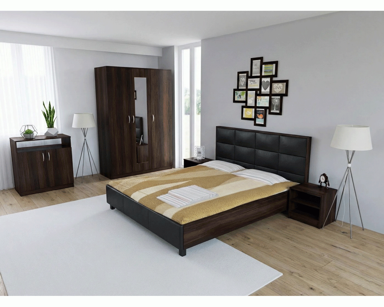 Dormitor Soft fabricat din PAL melaminat wenge cu grosimea de 16 mm. Dormitorul este compus din dulap cu 3 usi si oglinda pe usa din mijloc, pat pentru saltea de 140x200 cm, 2 noptiere si 1 comoda cu 2 usi. Dulapul are 6 spatii de depozitare cu polite si 1 spatiu cu bara de haine pentru umerase. Dimensiunile dulapului sunt: latime: 135 cm , inaltime: 200 cm , adancime: 53 cm. Patul are somiera din PAL simplu inclusa. Dimensiunile patului sunt: latime: 150 cm , lungime: 205 cm , inaltime: 97 cm. Comoda are 2 spatii de depozitare in spatele usilor si unul deasupra lor. Dimensiunile comodei sunt: latime: 75 cm , inaltime: 87 cm , adancime: 39 cm. Noptierele au cate 2 spatii de depozitare. Dimensiunile unei noptiere sunt: latime: 46 cm , inaltime: 44 cm , adancime: 37 cm. Manerele sunt din plastic cu filet metalic, iar toate piesele au picioruse din plastic la baza comodei cu rol impotriva zgarierii pardoselilor.