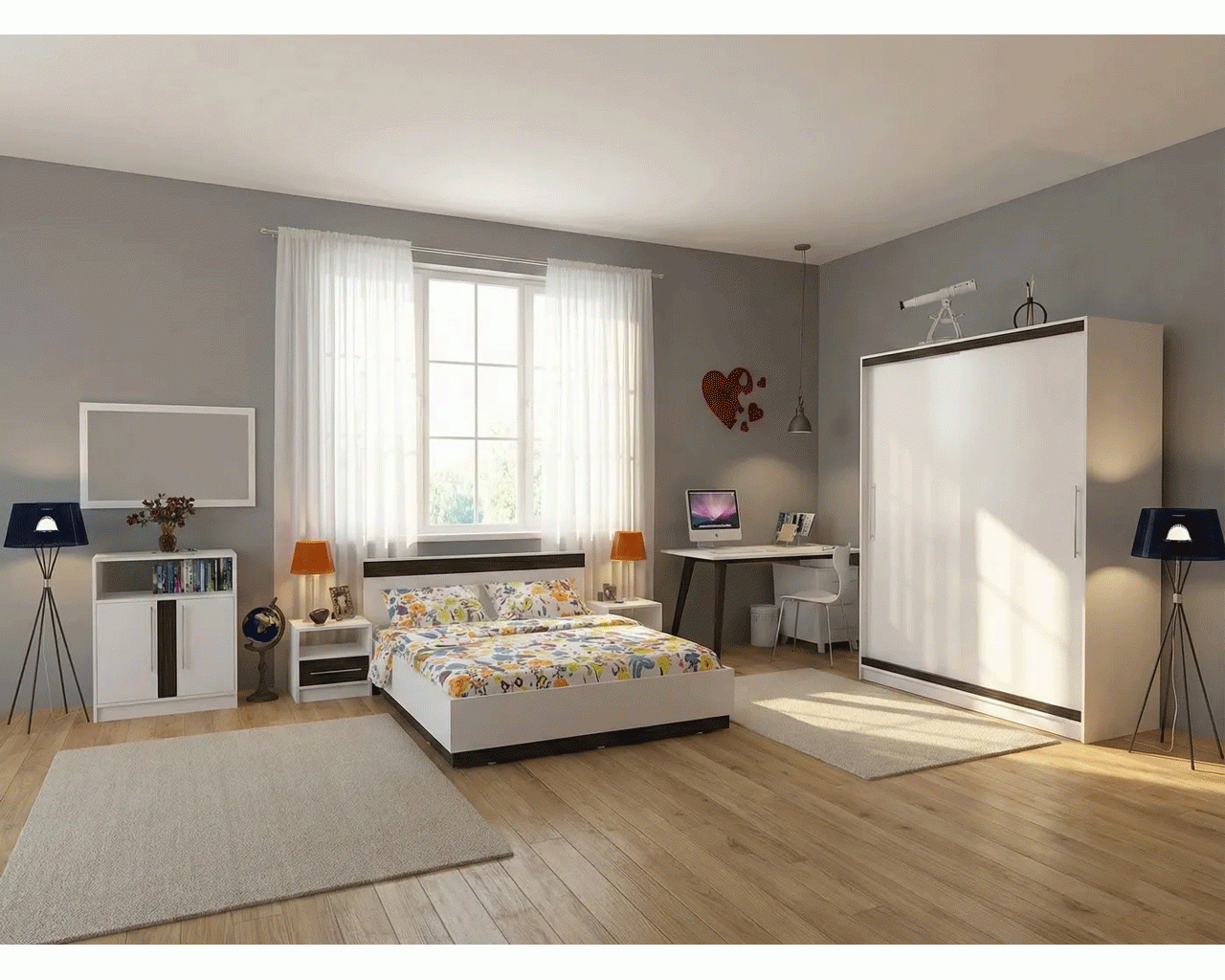 Dormitorul Verona reprezinta o alegere practica datorita dimensiunilor potrivite pentru orice dormitor, dar si pentru multiplele spatii de depozitare. Dormitorul este compus din dulap cu 2 usi culisante, pat pentru saltea 160x200 cm, 2 noptiere cu cate 1 sertar si comoda cu 2 usi. Dormitorul Verona este fabricat din PAL melaminat alb si gri cu grosimea de 16 mm si cant ABS alb cu grosimea de 0.4 mm. Manerele sunt metalice pentru o rezistenta sporita la uzura, dar si pentru un aspect modern. Toate piesele dormitorului au picioruse din plastic cu rol impotriva zgarierii pardoselilor.