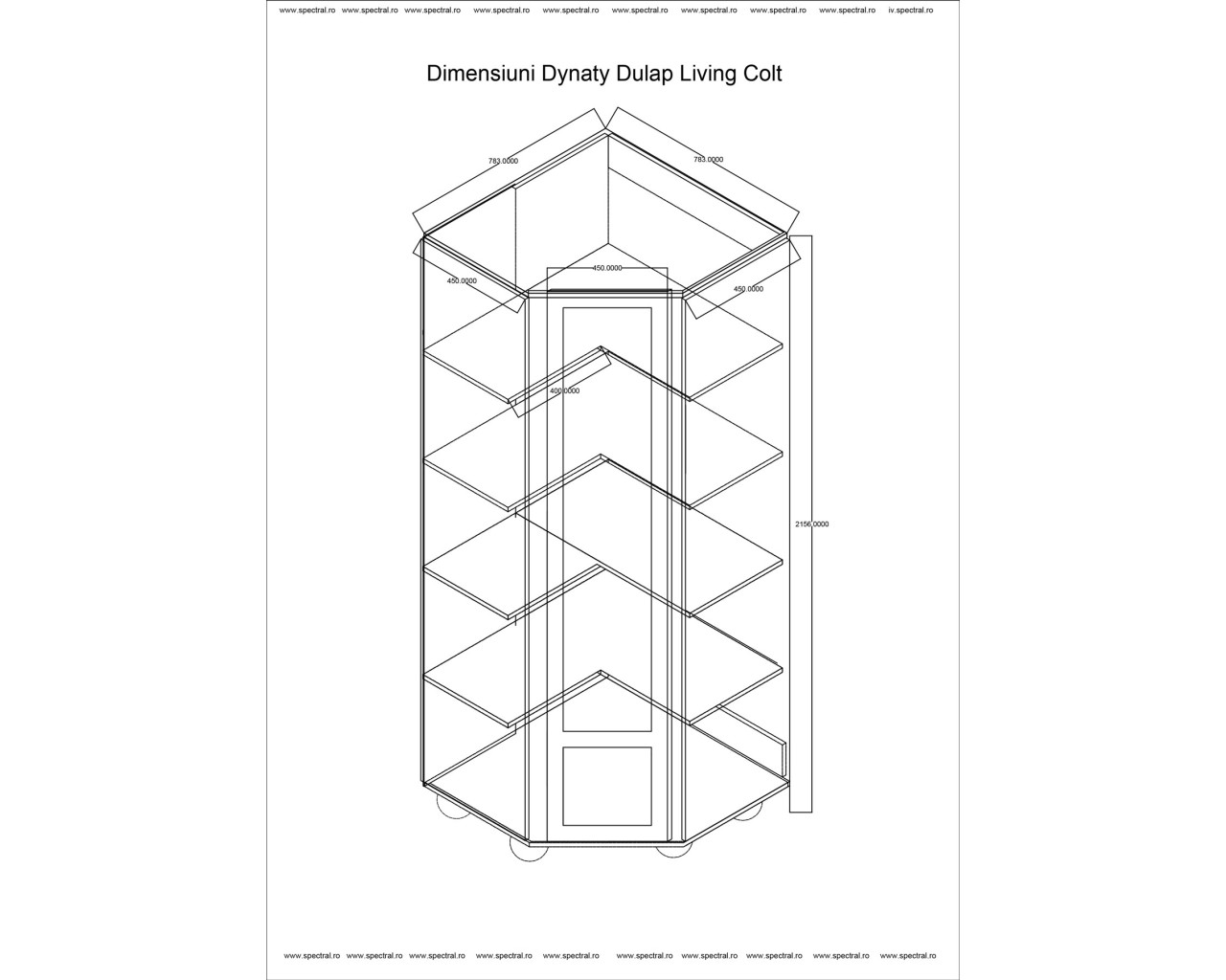 Are latimea de 480 mm cu tot cu ornamentul de sus (450 mm fara ornament), iar inaltimea este de 2161 mm ( cu ornament ) La interior se afla 5 spatii de depozitare pe polite.