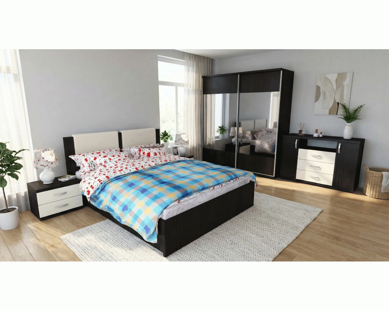 Dormitorul Laguna este o alegere moderna si practica datorita multiplelor spatii de depozitare. Dormitorul este compus din dulap cu 2 usi culisante cu oglinzi, pat pentru saltea de 160x200 cm cu 2 sertare, 2 noptiere cu cate 2 sertare si comoda cu 2 usi si 3 sertare.