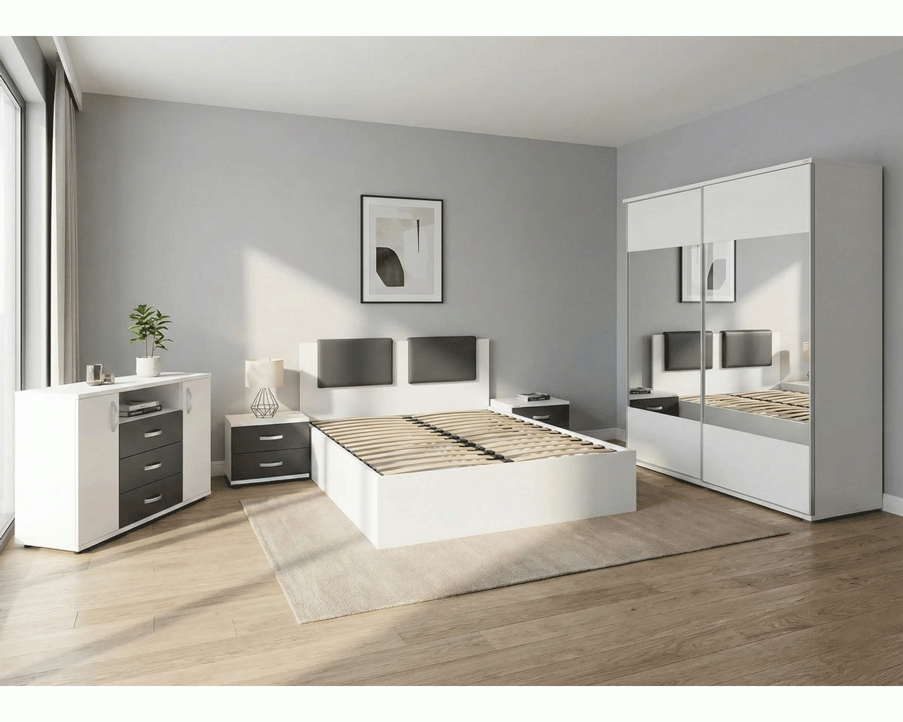 Dormitorul Laguna este o alegere moderna si practica datorita multiplelor spatii de depozitare. Dormitorul este compus din dulap cu 2 usi culisante cu oglinzi, pat pentru saltea de 160x200 cm cu somiera metalica rabatabila si lada, 2 noptiere cu cate 2 sertare si comoda cu 2 usi si 3 sertare.
