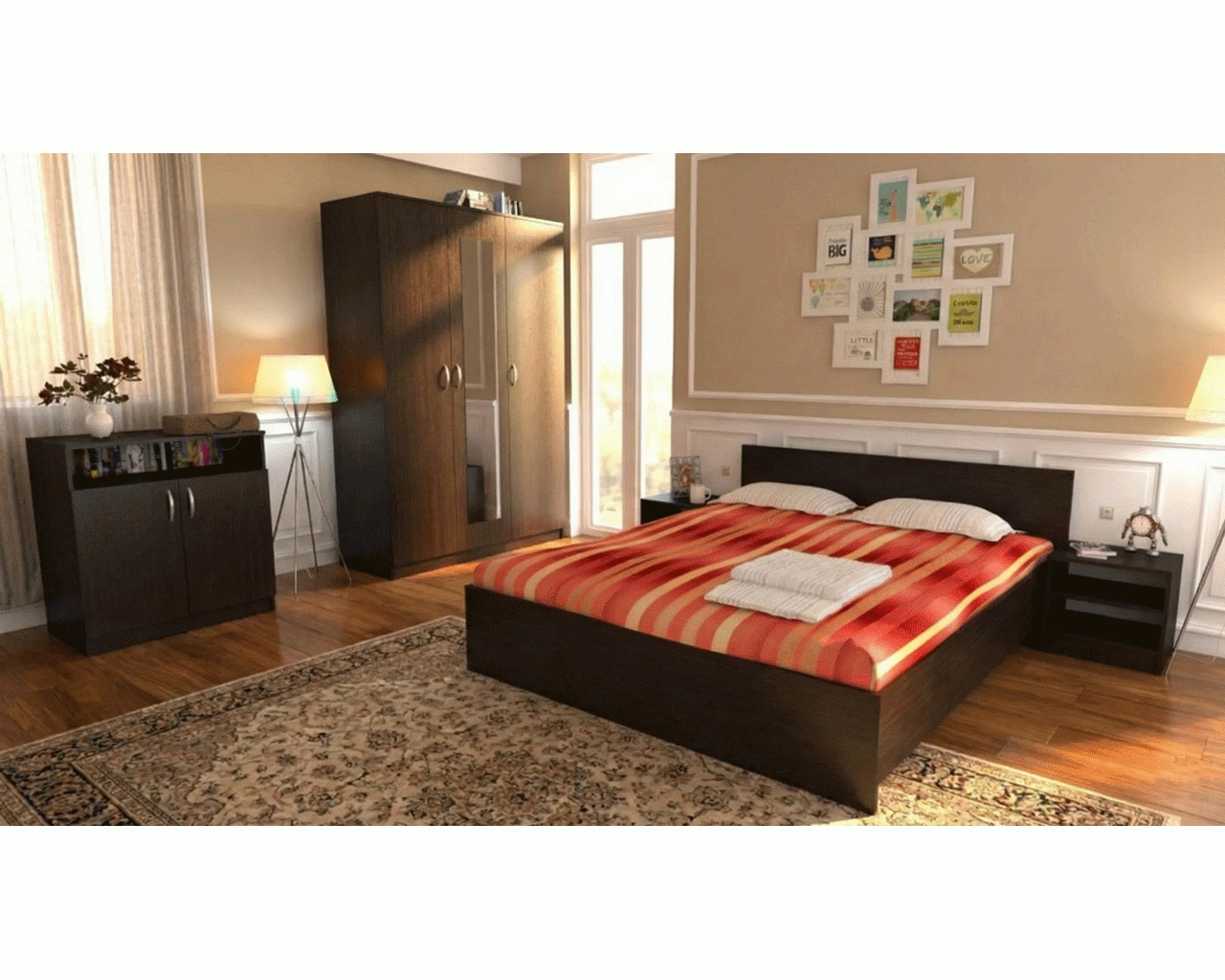 Dormitor Soft fabricat din PAL melaminat wenge cu grosimea de 16 mm. Dormitorul este compus din dulap cu 3 usi si oglinda pe usa din mijloc, pat pentru saltea de 120x200 cm, 2 noptiere si 1 comoda cu 2 usi. Dulapul are 6 spatii de depozitare cu polite si 1 spatiu cu bara de haine pentru umerase. Dimensiunile dulapului sunt: latime: 135 cm , inaltime: 200 cm , adancime: 53 cm. Patul are somiera din PAL simplu inclusa. Dimensiunile patului sunt: latime: 124 cm , lungime: 204 cm , inaltime: 70 cm. Comoda are 2 spatii de depozitare in spatele usilor si unul deasupra lor. Dimensiunile comodei sunt: latime: 75 cm , inaltime: 87 cm , adancime: 39 cm. Noptierele au cate 2 spatii de depozitare. Dimensiunile unei noptiere sunt: latime: 46 cm , inaltime: 44 cm , adancime: 37 cm. Manerele sunt din plastic cu filet metalic, iar toate piesele au picioruse din plastic la baza comodei cu rol impotriva zgarierii pardoselilor.