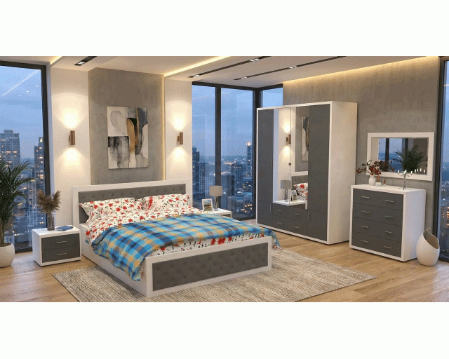 Dormitorul Torino reprezinta o alegere eleganta datorita aspectului deosebit si practica datorita multiplelor spatii de depozitare. Dormitorul este compus din dulap cu 6 usi si 2 sertare, comoda cu 4 sertare, pat pentru saltea de 160 x 200 cm si 2 noptiere cu cate 2 sertare.