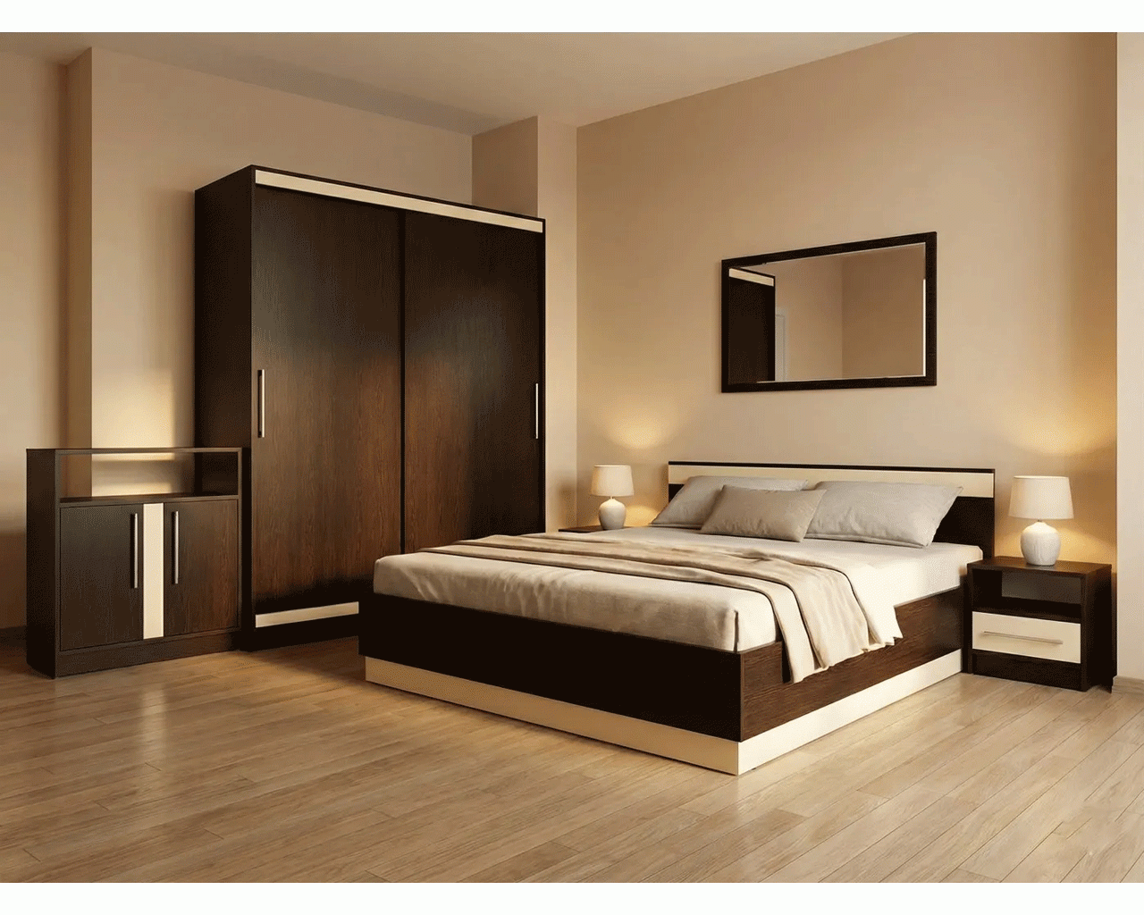 Dormitorul Verona reprezinta o alegere practica datorita dimensiunilor potrivite pentru orice dormitor, dar si pentru multiplele spatii de depozitare. Dormitorul este compus din dulap cu 2 usi culisante, pat pentru saltea 160x200 cm, 2 noptiere cu cate 1 sertar si comoda cu 2 usi. Dormitorul Verona este fabricat din PAL melaminat wenge si vanilie cu grosimea de 16 mm si cant ABS wenge cu grosimea de 0.4 mm. Manerele sunt metalice pentru o rezistenta sporita la uzura, dar si pentru un aspect modern. Toate piesele dormitorului au picioruse din plastic cu rol impotriva zgarierii pardoselilor.