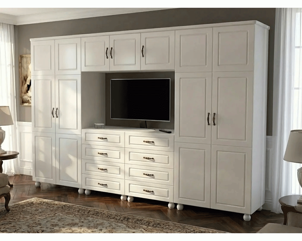Dimensiunile totale ale ansamblului sunt de 3180 mm lungime, 2160 mm inaltime si 590 mm adancime. Dimensiunile spatiului pentru televizor sunt de 1350 mm latime si 780 mm inaltime.