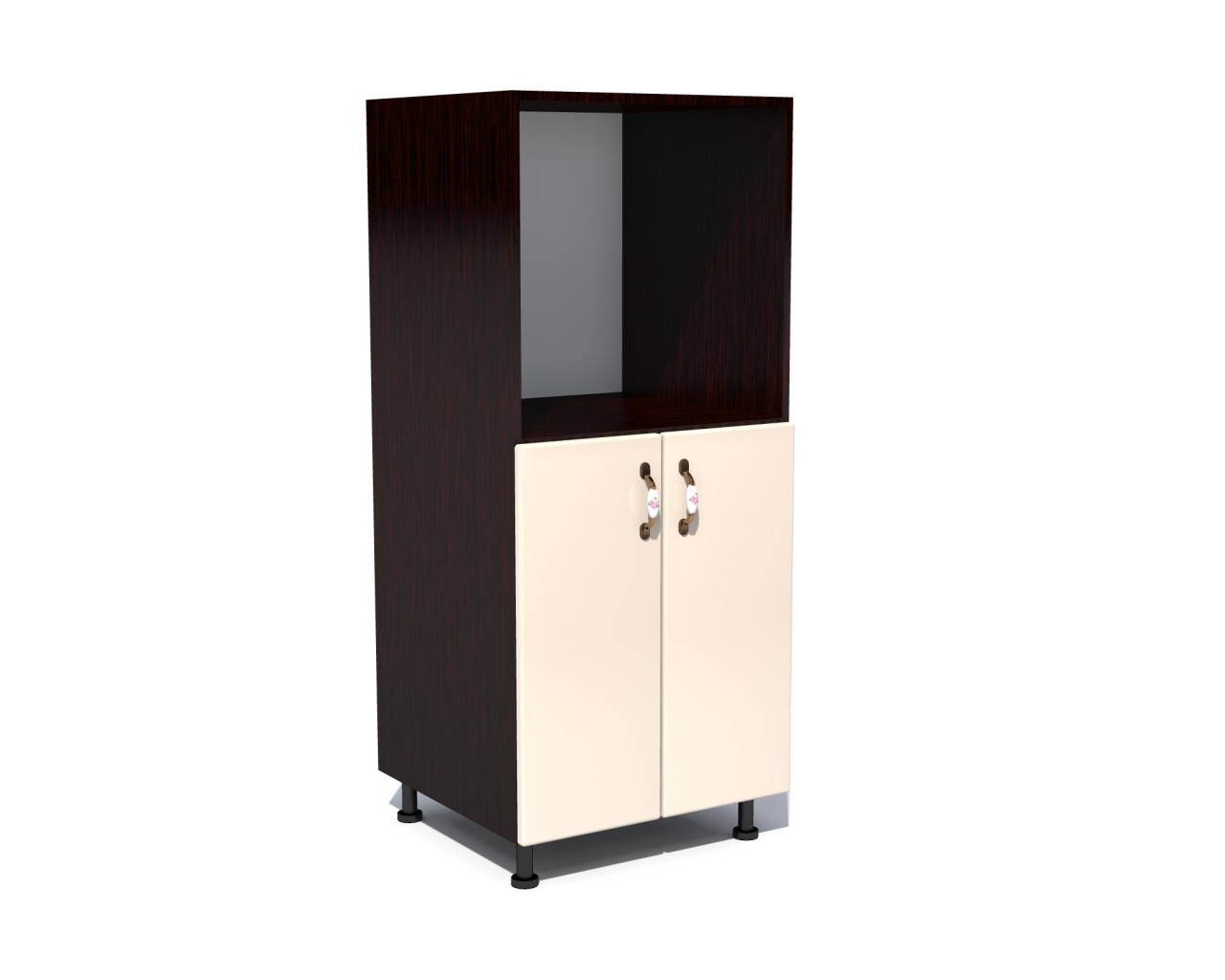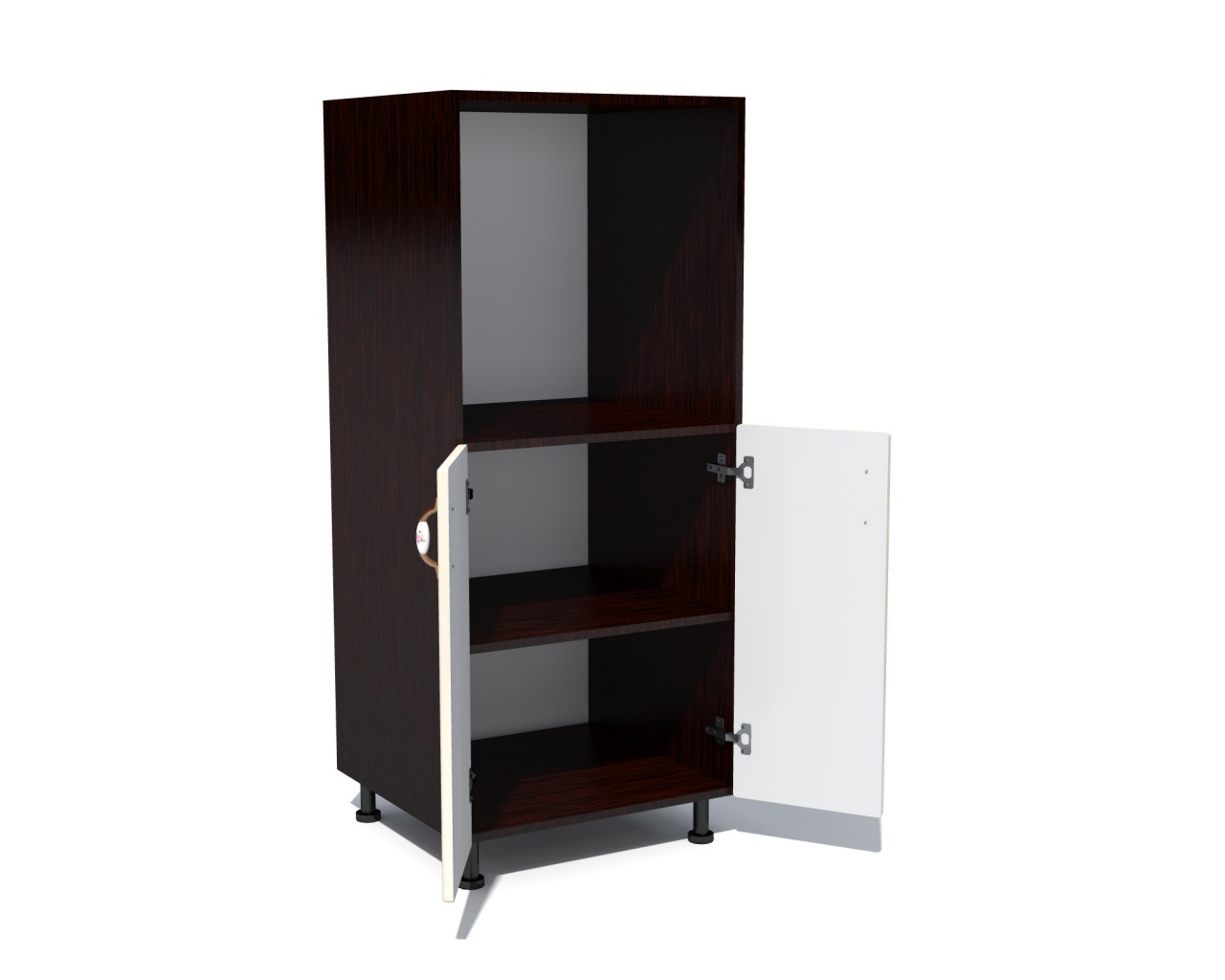 Materiale folosite: Pal melaminat, usi din MDF infoliat, manere metalice cu insertie portelan, balamale cu piston (inchidere soft close), picioare reglabile plastic 100 mm.
