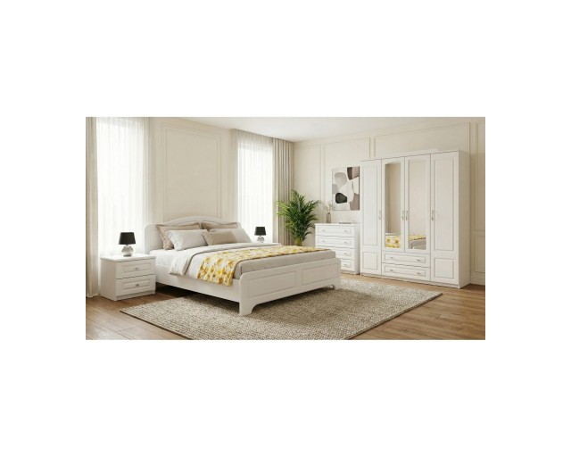 Pretul afisat cuprinde dulapul cu 4 usi si 2 sertare, comoda cu 4 sertare, patul pentru saltea 160x200 cm si 2 noptiere. Pentru o alta configuratie a dormitorului puteti alege produsele dorite din partea de jos a paginii la PRODUSE COORDONATE.
